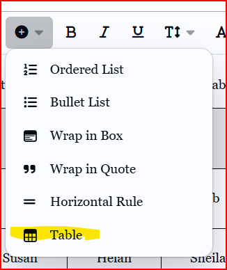 Just trying out the new feature to create tables. Just click on the “+” icon and then select “Table”. It’s a bit clumsy to work with at present but, I’m sure it will get better over time. 1 2 3 Jim John Bob Susan Helan Sheila